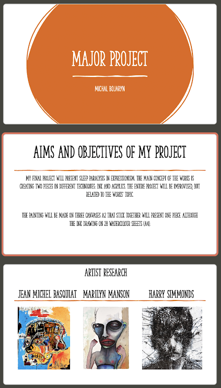 Okay decent presentation, but when we discussed the improvisation element of your work, it would be based on the ink drawings you made in Week 6/7. As far as I am concerned this work is still related to expressionism, the idea of sleep paralysis (as your work is quite 'nightmarish') and you should still be posting about those elements. You can improvise with your work in the studio or at home but still related to these themes.